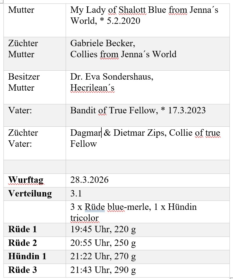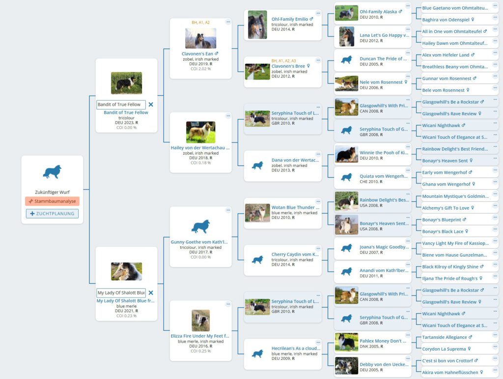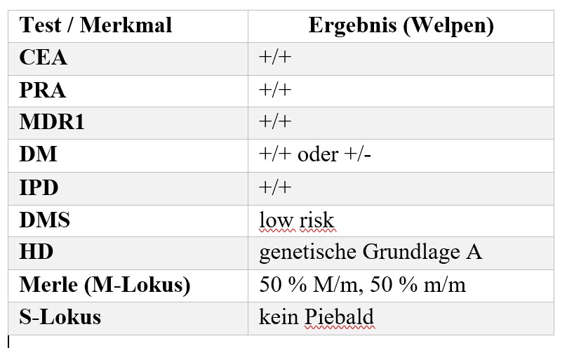 Daten Stammbaum https://collie.breedarchive.com/animal/testmating?sire_uuid=54cbc176-9488-450b-8a1a-c8c1dd3dfb4d&dam_uuid=d5692291-8d02-4d21-9199-f2514826cf12 Daten Wurf Gesundheitswerte Welpen, soweit bekannt