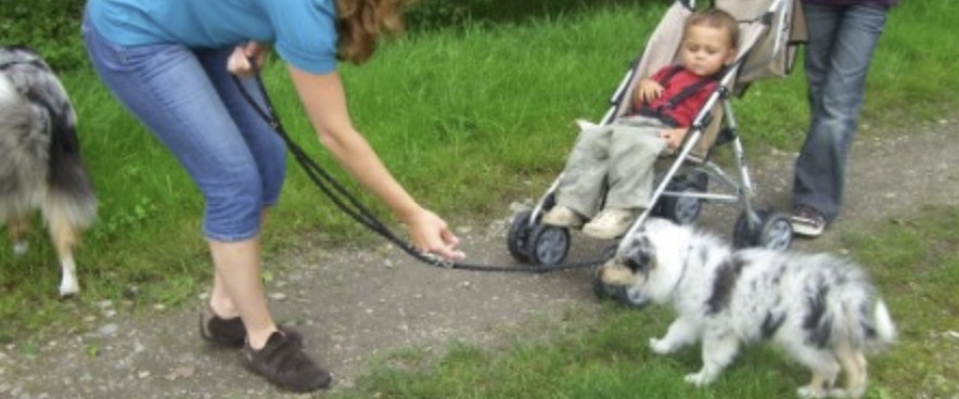 Je nach Impfstatus und Entwicklung ist auf jedem Spaziergang mit den großen Hunden mindestens ein Welpe dabei, mit und ohne Leine, je nach Temperament